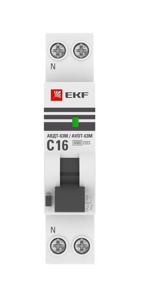 Автомат. выкл. дифф. тока 2-пол. 16А 10мА тип AC 6кА хар-ка C серия АВДТ-63М 16А/ 10мА (1мод., хар.C, электронный тип AС) 6кА EKF PROxima