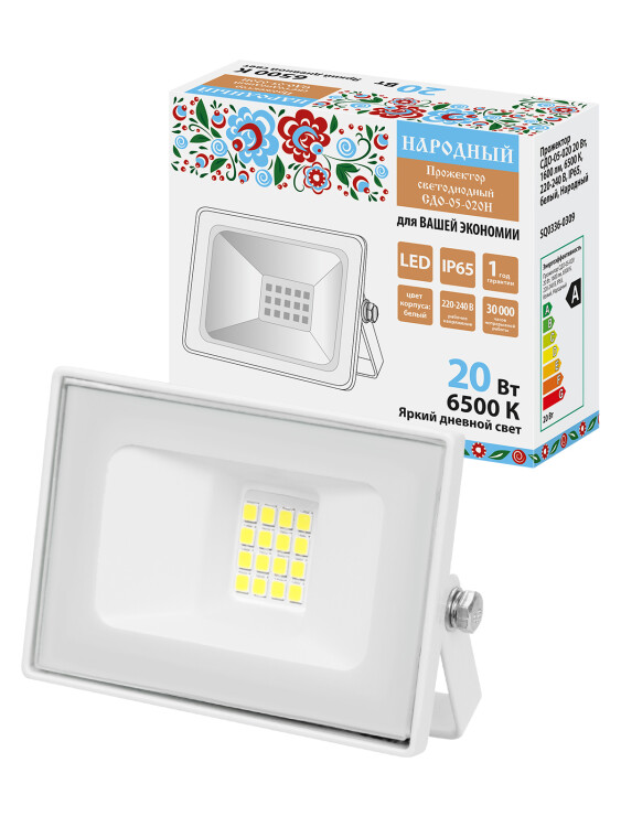 Прожектор СДО-05-020 20 Вт, 1600 лм, 6500 К, 220-240 В, IP65, белый, Народный