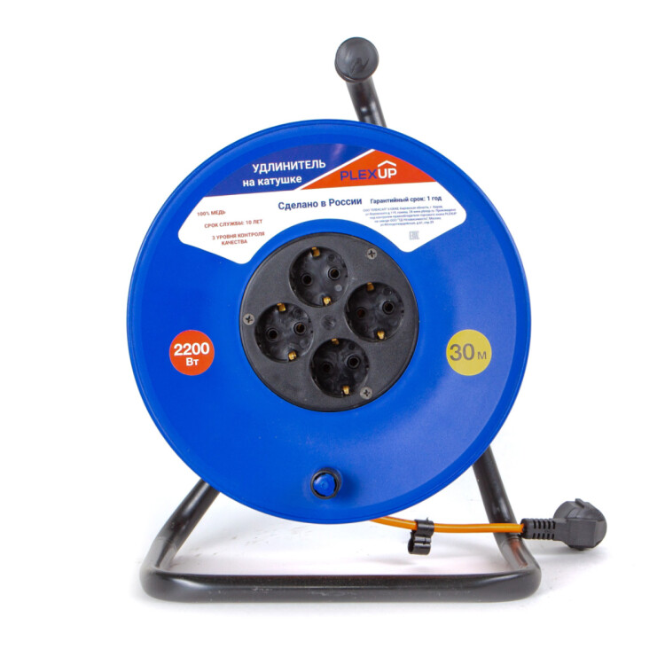 Удлинитель на катушке, 4 розетки, длина 30 м, 10А, ПВС 3х1мм², с/з, IP20, пластик, 2200Вт