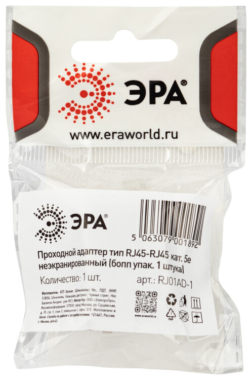 Проходной адаптер ЭРА тип RJ45-RJ45 категория 5е неэкранированный упаковка 1 шт.