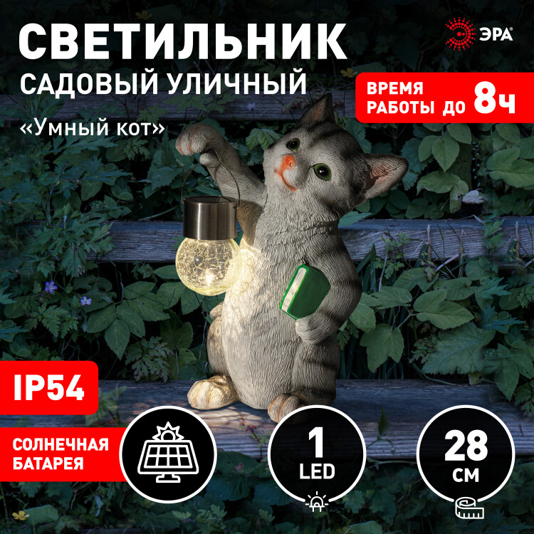Светильник уличный ЭРА ERASF22-10 на солнечной батарее садовый Умный кот 28 см