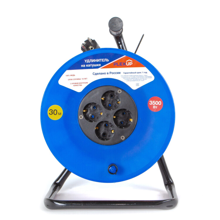Удлинитель на катушке, 4 розетки, длина 30 м, 16А, ПВС 3х1,5мм², с/з, IP20, пластик, 3500Вт
