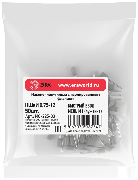 Наконечник-гильза ЭРА NO-225-83 НШвИ 0,75-12 с изолированным фланцем (упаковка 50 шт.)