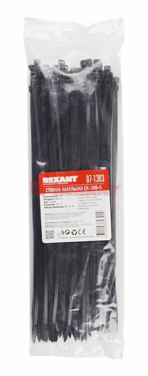 Стяжка кабельная нейлоновая 300x4,8мм, черная (100 шт/уп) REXANT