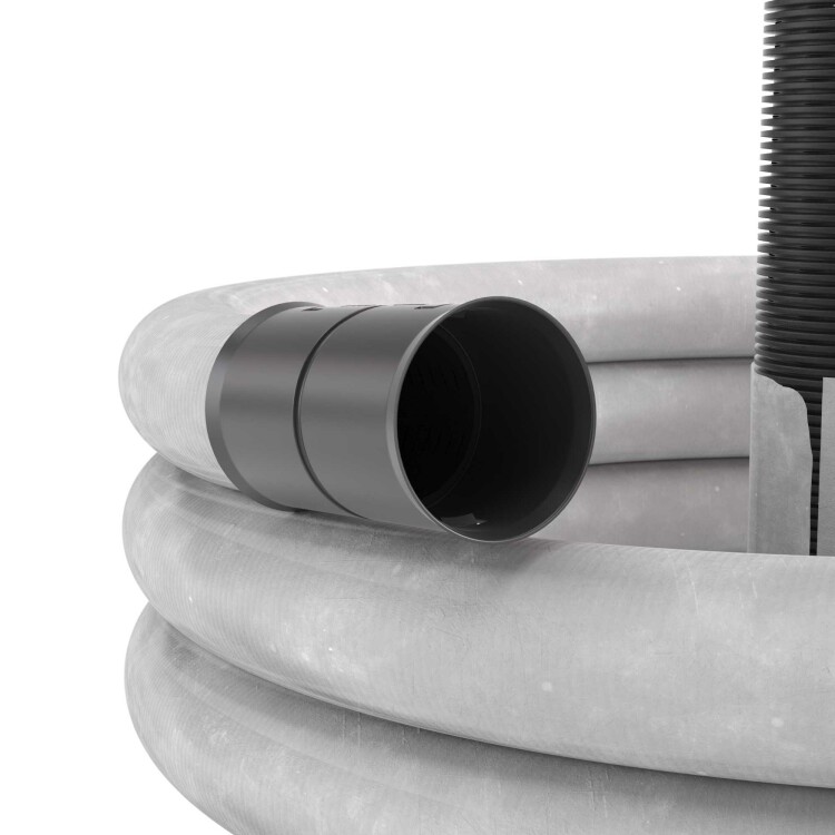 Труба двустенная ПНД гибкая д.110мм дренажная Бухта 50м, без протяжки, цвет черный, с муфтой, с геофильтром, SN6,перфорация 360 град.