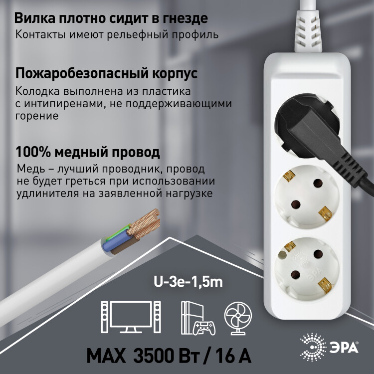 Удлинитель электрический ЭРА U-3e-1,5m-3x1,5 с заземлением 3 розетки 1,5м ПВС 3x1,5мм2 16А