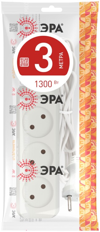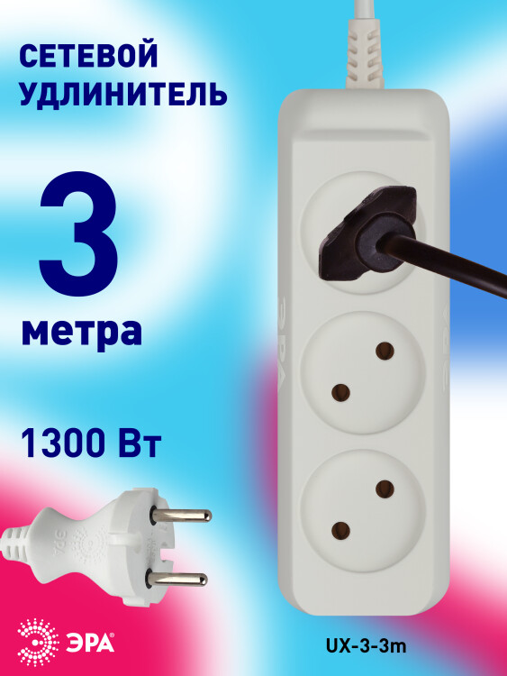 Удлинитель,3розетки, длина 3 м, 10А, ШВВП 2х1 мм?, б/з, IP20, термопласт, белый, UX-3-3m(new)