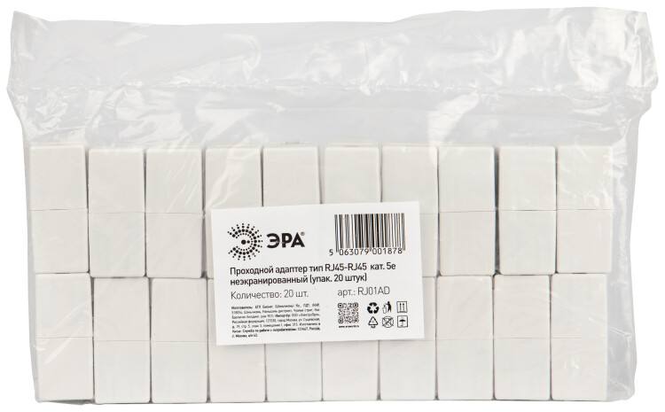 Проходной адаптер ЭРА тип RJ45-RJ45 категория 5е неэкранированный упаковка 20 штук