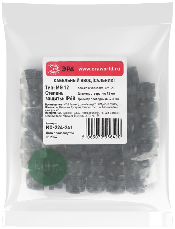 Кабельный ввод сальник ЭРА NO-224-241 MG 12 (d отв.12 мм / d провод.4-8 мм) IP68 (упаковка 20 штук)