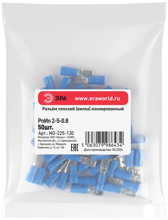 Разъем плоский ЭРА NO-225-130 РпИп 2-5-0.8 изолированный «вилка» (упаковка 50 штук)