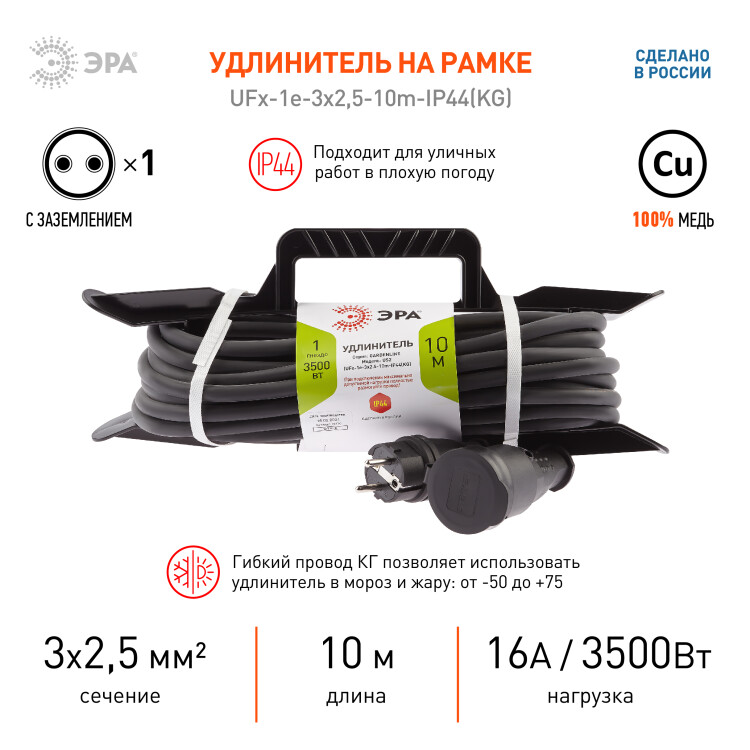 Удлинитель силовой ЭРА UFx-1e-3x2,5-10m-IP44(KG) на рамке с заземлением 1 розетка 10 м КГ 3х2,5мм2