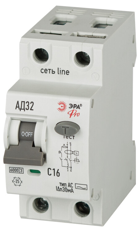АВДТ 6кА ЭРА PRO D326M2C16АC30 АД-32 электромеханическое 1P+N C16 30мА тип АC