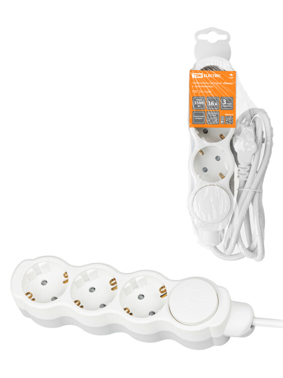 Удлинитель бытовой "Люкс" с выкл., 3 гнезда, 10 м, с/з, с з/ш, ПВС 3х1 мм2, 16 А, 250 В, 3500 Вт TDM