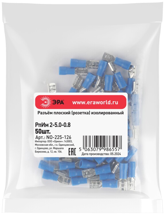 Разъем плоский ЭРА NO-225-126 РпИм 2-5.0-0.8 изолированный «розетка» (упаковка 50 штук)