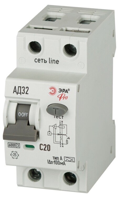 АВДТ 6кА ЭРА PRO D326E2C20А100 АД-32 электронное 1P+N C20 100мА тип А