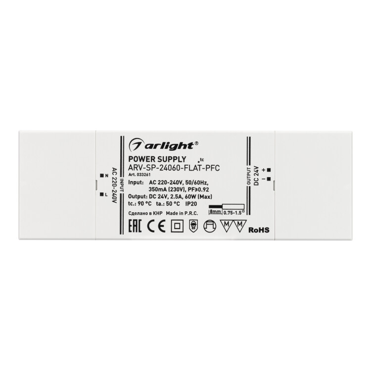 Блок питания ARV-SP-24060-FLAT-PFC (24V, 2.5A, 60W) (Arlight, IP20 Пластик, 5 лет)