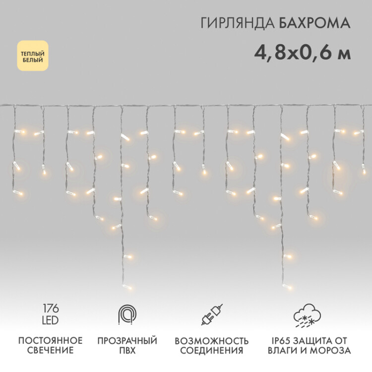 Гирлянда светодиодная Баxрома (Айсикл) 4,8x0,6м 176 LED ТЕПЛЫЙ БЕЛЫЙ прозрачный ПВХ IP65 постоянное свечение 230В нужен блок 303-500-1 NEON-NIGHT