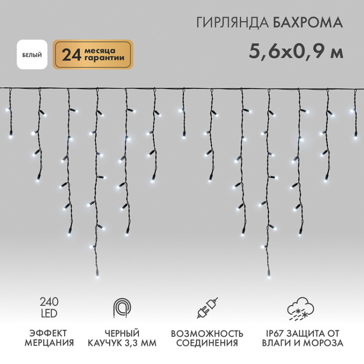 Гирлянда светодиодная Баxрома (Айсикл) 5,6x0,9м 240 LED БЕЛЫЙ черный каучук 3,3мм IP67 эффект мерцания 230В нужен блок 315-000 NEON-NIGHT