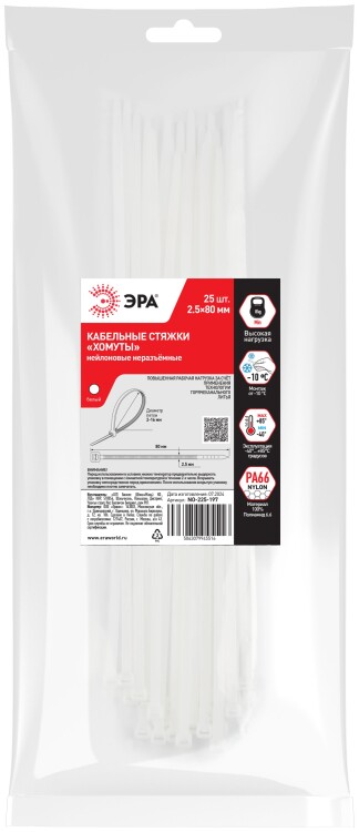 Кабельная стяжка ЭРА NO-225-197 (хомут) нейлоновая 2.5 х 80 мм белая (25 шт/уп)