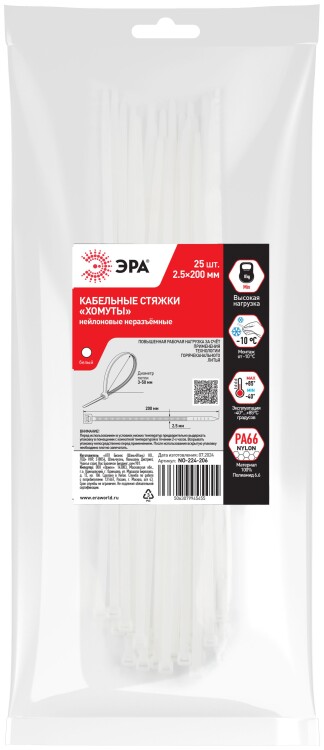Кабельная стяжка ЭРА NO-224-206 (хомут) нейлоновая 2.5 х 200 мм белая (25 шт/уп)