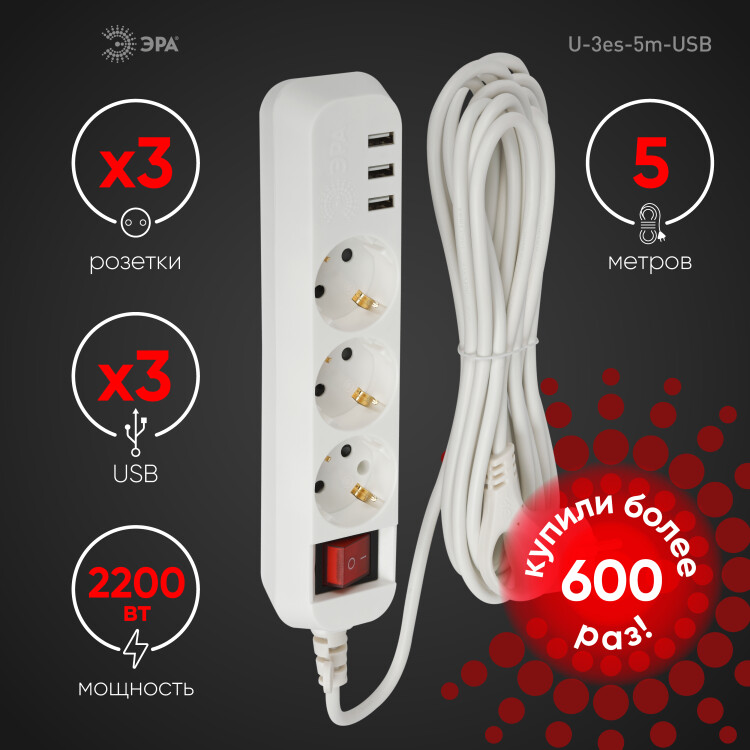 Удлинитель электрический ЭРА U-3es-5m-USB c заземлением с выключателем 3 розетки + 3xUSBA 5м 10А