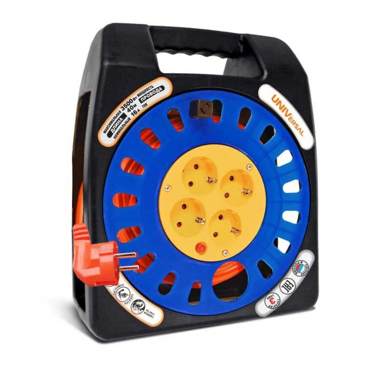 Удлинитель на катушке, 4 розетки, длина 40 м, 16А, ПВС 3х1,5 мм?, с/з, IP44, пластик, чёрный/синий/жёлтый, оранжевый, У16-012