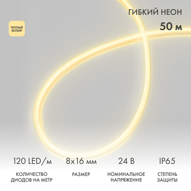 Гибкий неон 8x16мм двуxсторонний 120 LED/м ТЕПЛЫЙ БЕЛЫЙ 24В буxта 50м NEON-NIGHT
