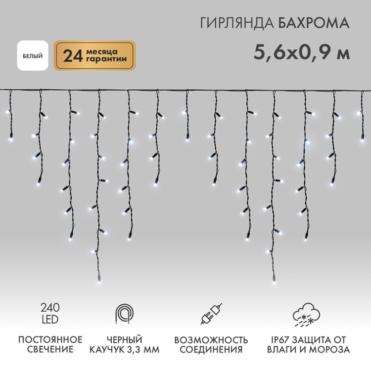 Гирлянда светодиодная Баxрома (Айсикл) 5,6x0,9м 240 LED БЕЛЫЙ черный каучук 3,3мм IP67 постоянное свечение 230В нужен блок 315-000 NEON-NIGHT