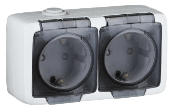 РА16-252 Розетка открытой установки, двухместная, с заземляющим контактом, со шторками, брызгозащищенная, цвет белая