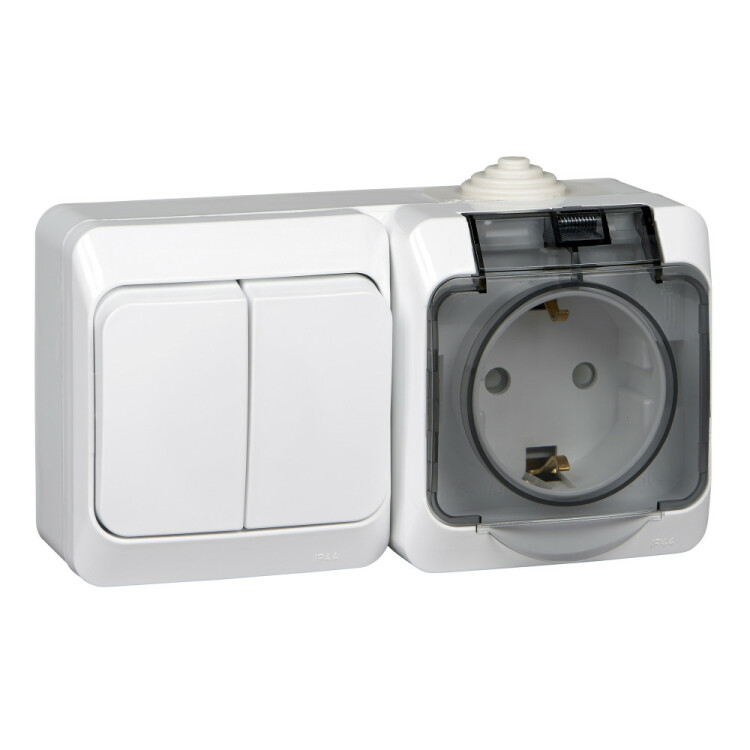 Блок выключатель 2 клавишный+розетка 2Р+Е со шторками накладной белый IP44 Этюд