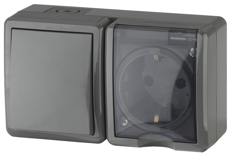 Блок выключатель 1 клавишный+розетка 2Р+Е накладной 11-7401-03 серый IP54 ЭРА