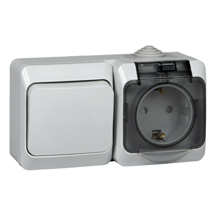 Блок выключатель 1 клавишный+розетка 2Р+Е со шторками накладной серый IP44 Этюд