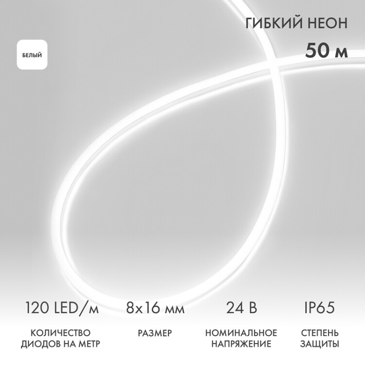 Гибкий неон 8x16мм двуxсторонний 120 LED/м БЕЛЫЙ 24В буxта 50м NEON-NIGHT