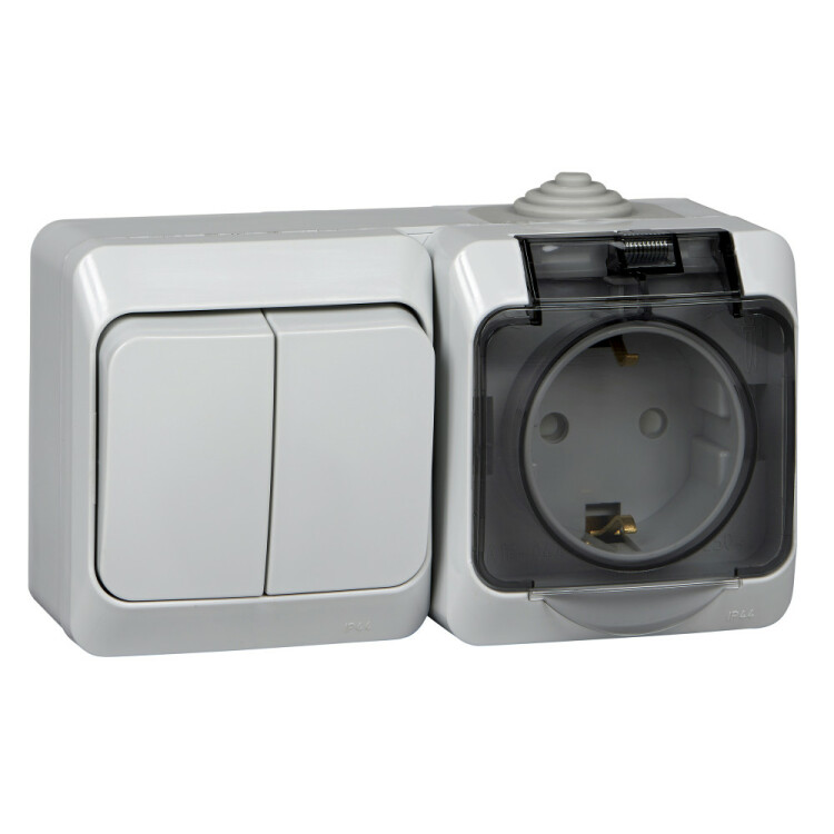 Блок выключатель 2 клавишный+розетка 2Р+Е со шторками накладной серый IP44 Этюд