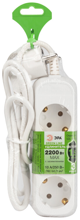 Удлинитель электрический ЭРА UDL-10-315-E Greenline 3 розетки с заземлением 1,5м ПВС 3x0.75мм2
