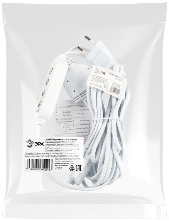 Разветвитель сетевой для линейных светильников ЭРА Разветвитель 5х IEC C7-timer 2 м с таймером для 5 светильников