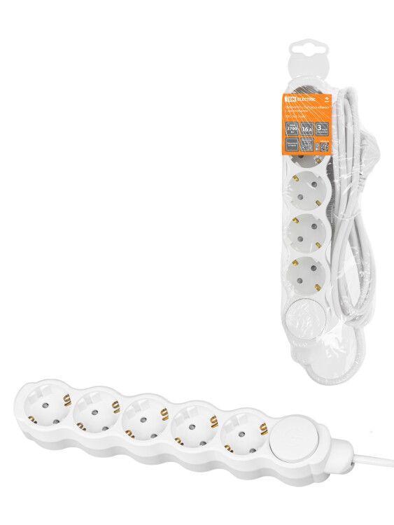 Удлинитель бытовой "Люкс" с выкл., 5 гнезд, 10 м, с/з, с з/ш, ПВС 3х1,5 мм2, 16 А, 250 В, 3700Вт TDM