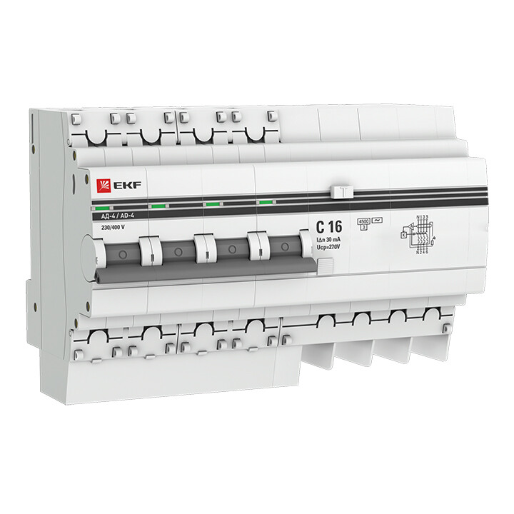 Дифференциальный автомат АД-4 16А/10мА (х-ка C, АС, электронный) 4,5кА EKF PROxima