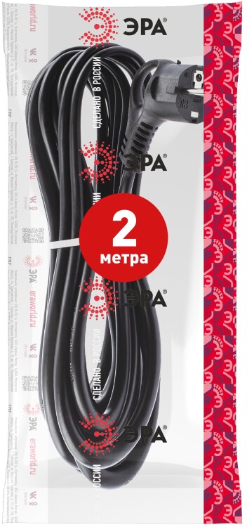Шнур сетевой с вилкой ЭРА U-3x1-2m-B с заземлением 2м ПВС 3x1мм2 черный