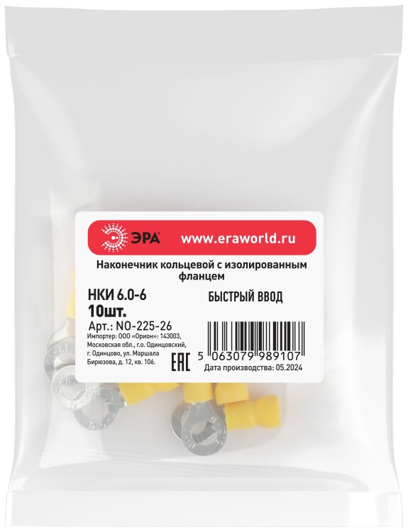 Наконечник кольцевой ЭРА NO-225-26 НКИ 6.0-6 с изолированным фланцем (упаковка 10 шт.)