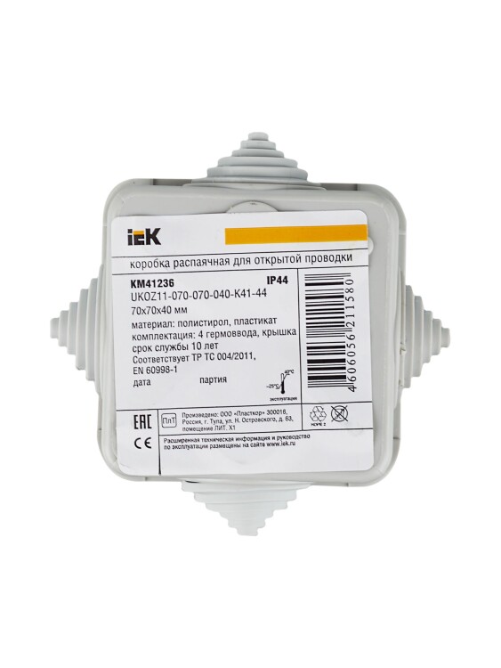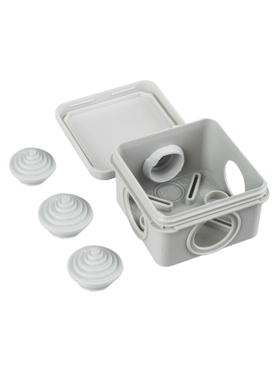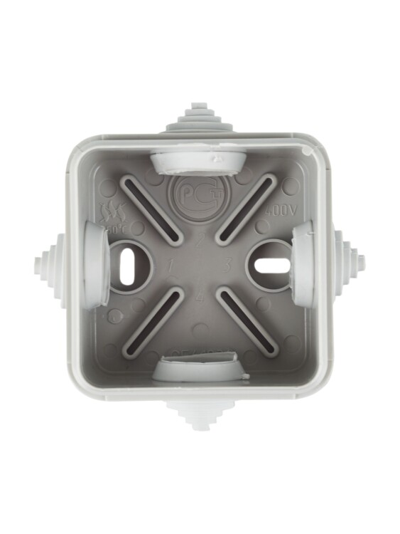 Коробка КМ41236 распаячная для о/п 70х70х44 мм IP44 (Серая RAL7035, 4 гермоввода, защелкивающаяся крышка)
