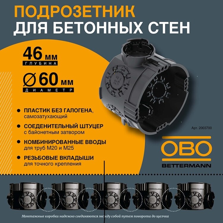 Коробка установочная 68(60)х45 в БЕТОН, 7 вводов, без винтов, 25 шт в уп. Тип: UG 46