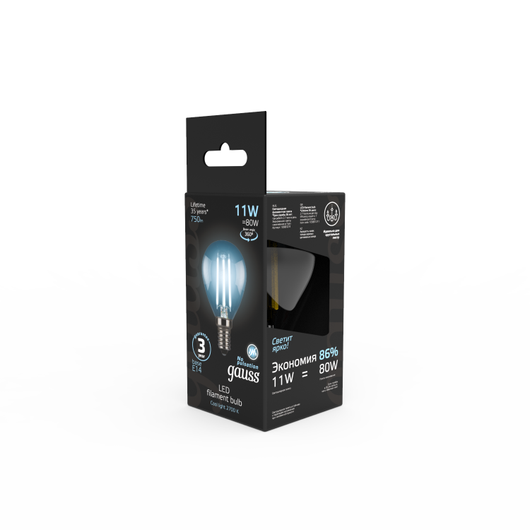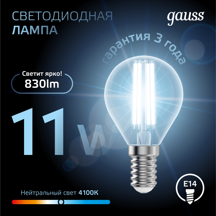 Лампа светодиодная 11 Вт 230В Е14 Filament шарик, холодный 4100К