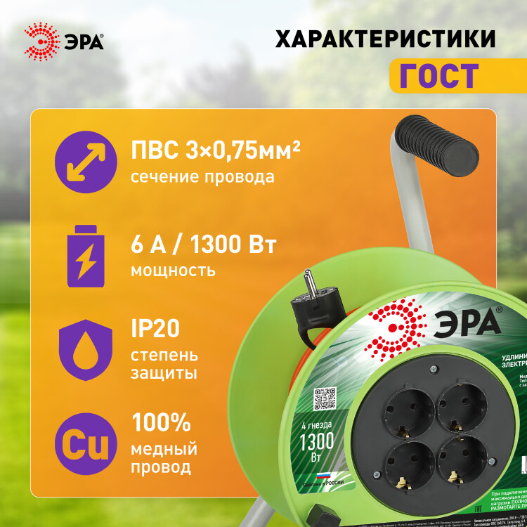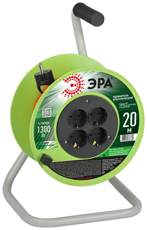 Удлинитель силовой ЭРА RP-4e-3х0.75-20m на пластиковой катушке c заземлением 4 розетки 20м ПВС 3х0,75мм2