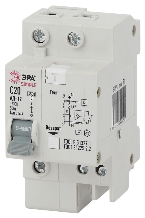 Автоматический выключатель дифференциального тока ЭРА SIMPLE SIMPLE-mod-30 1P+N 20А 30мА тип АС х-ка