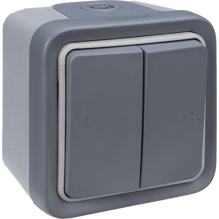 Переключатель 2 клавишный накладной серый IP55 Plexo