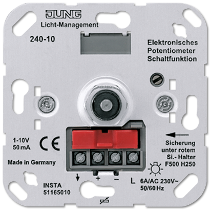Роторный электронный потенциометр для регуляции люминесцентных ламп и/или электронных трансформаторов с 1 – 10 В управляющего напряжения, со встроенным выключателем; универсальные встраиваемые механизмы