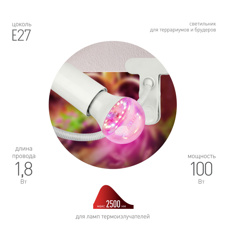 Светильник для террариумов и брудеров ЭРА FITO-E27-FLEX-100W-GR c клипсой для ламп до 100 Вт и гибкой стойкой