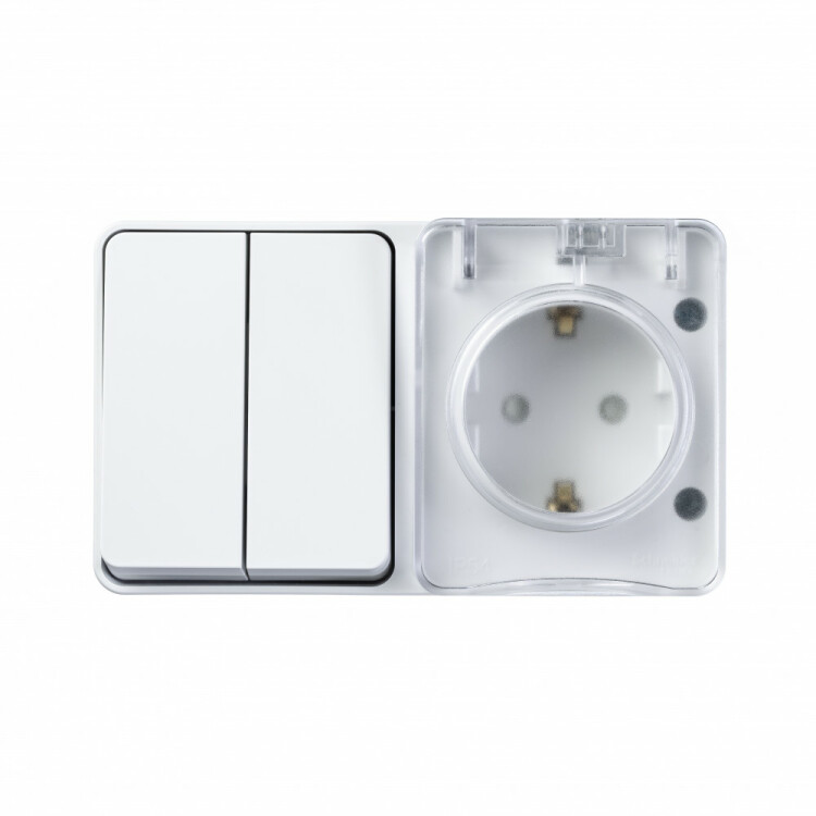 Блок выключатель 2 клавишный + розетка 2Р+Е со шторками накладной белый AtlasDesign Profi54