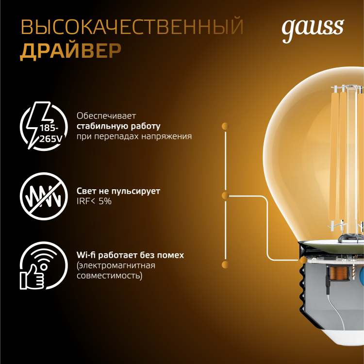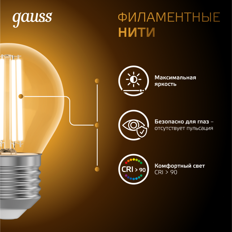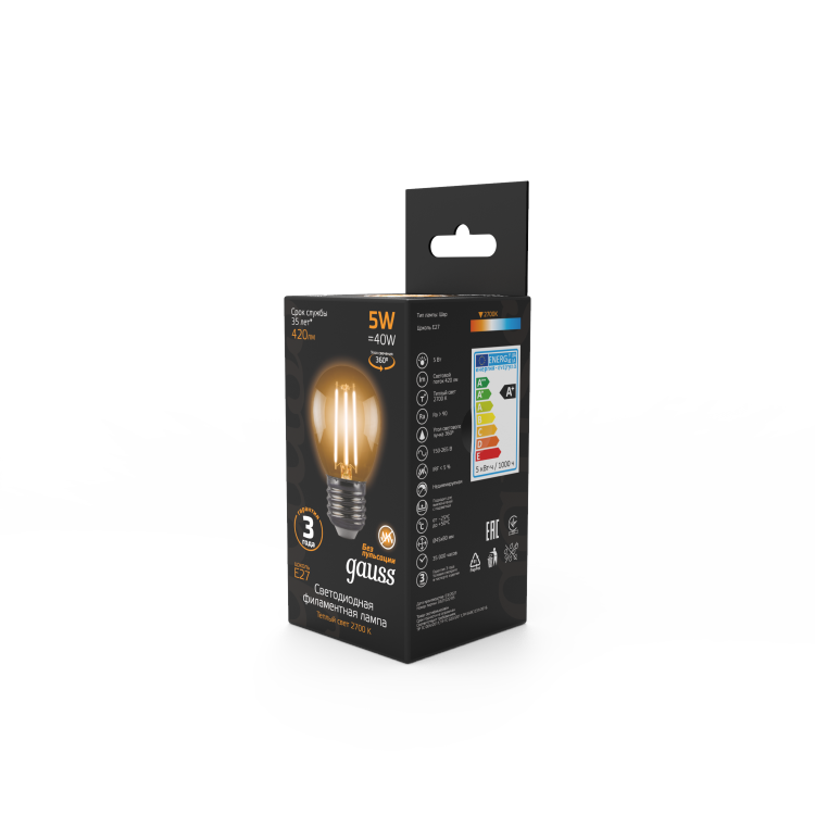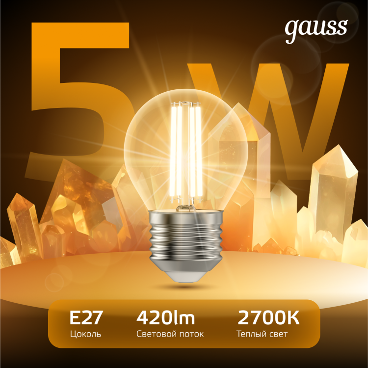 Лампа светодиодная 5 Вт 230В Е27 Filament шарик, тёплый 2700К